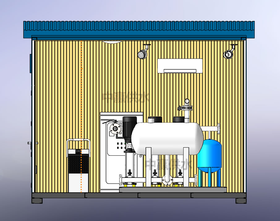 3、整套智慧泵房采用整體式結(jié)構(gòu),工廠預(yù)制,現(xiàn)場安裝快速簡便,施工周期大大縮短;現(xiàn)場提前做好基礎(chǔ)后只需提供一個電源和對接進(jìn)出口管路即可快速供水。