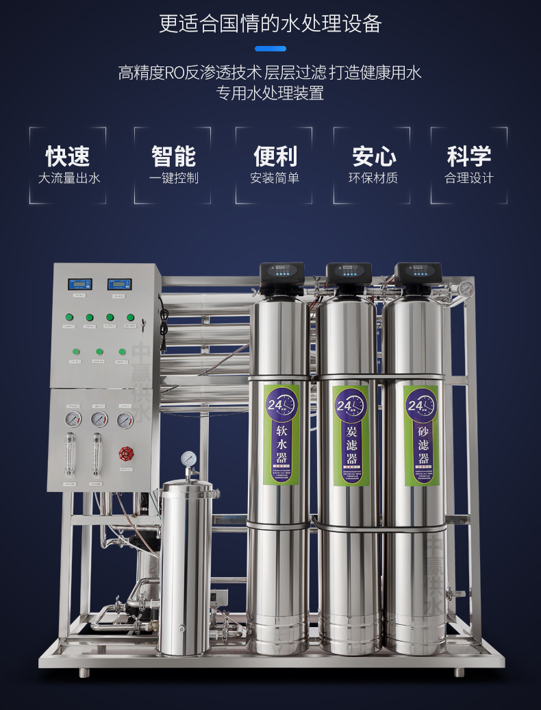 采用多次過濾層的過濾器,主要目的是去除原水中含有的泥沙、鐵銹、膠體物質(zhì)、懸浮物等顆粒在20um以上的物質(zhì),可選用手動閥門控制或者全自動控制器進行反沖洗、正沖洗等一系列操作。保證設備的產(chǎn)水質(zhì)量,延長設備的使用壽命。