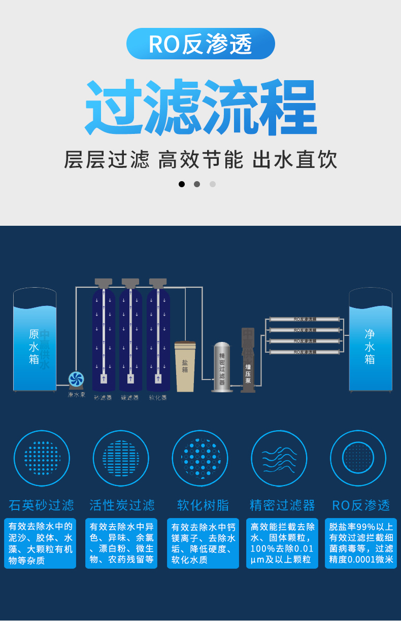 原水 → 原水箱 → 原水泵 →多介質(zhì)過濾器 (石英砂過濾器)→活性炭過濾器 →軟水處理器(添加阻垢劑裝置) → 精密過濾器 → 高壓泵 → 一級反滲透(RO)裝置 →紫外線殺菌裝置(臭氧殺菌裝置) → 用水點